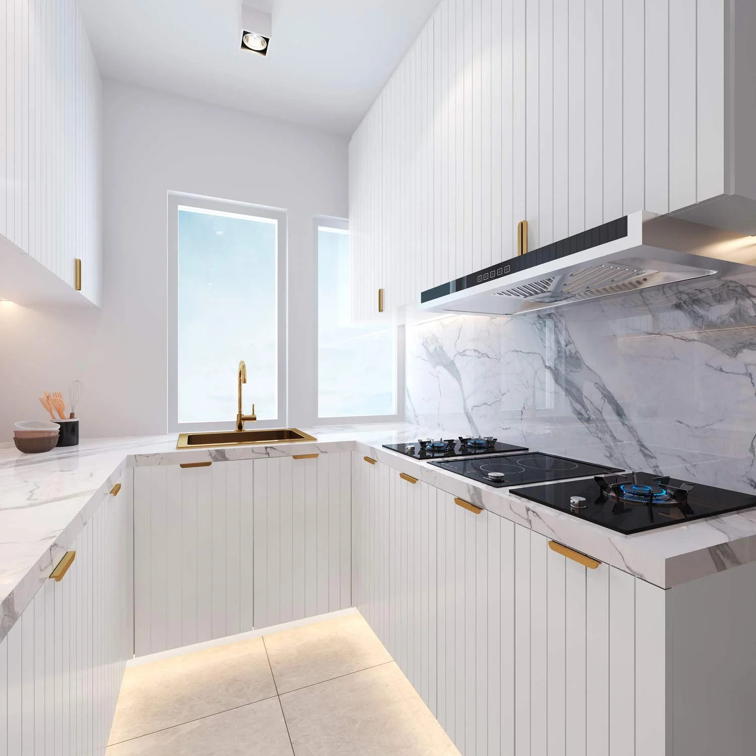 Taking advantage of the light in this apartment, we completed a full renovation of the space in a sophisticated, contemporary coastal tone, using warm neutral colours and textures. We maximised space, storage, and light in the galley kitchen. The addition of a freestanding bath, curved mirrors, brass fittings and a clever use of mirror transformed the bathrooms. The lounge and dining areas were opened and made more multifunctional, to accommodate the client’s changing family dynamic. Light and storage was again the focus in the bedrooms, with a playful touch added to their daughter’s room.